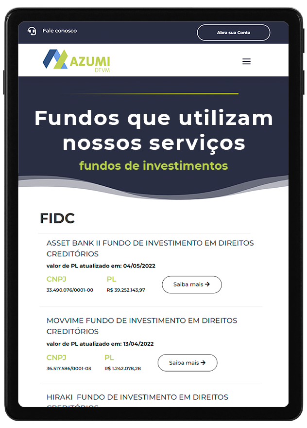 A Azumi DTVM oferece os serviços de administração, custódia e escrituração de fundos com toda responsabilidade legal.
